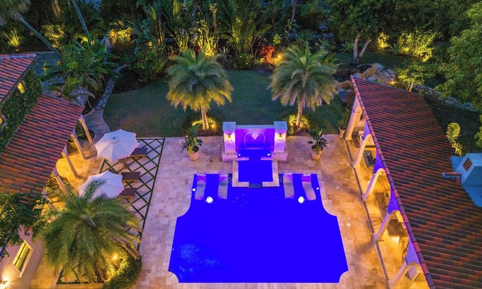 This listing contains two back to back listings to accomadate larger parties (9bd, 5.5bths). Lush botanical gardens and rare tropical fruit trees, 2 custom pools, spa, elite home gym, basketball / pickleball court. There is a fully-equipped kitchen, fireplace, TV, and dining space. Enjoy leisurely games of pool and shuffleboard, then retreat to the luxurious indoors with comfortable beds and a massive TV, all within the privacy of a walled-in estate. Your lavish escape awaits.