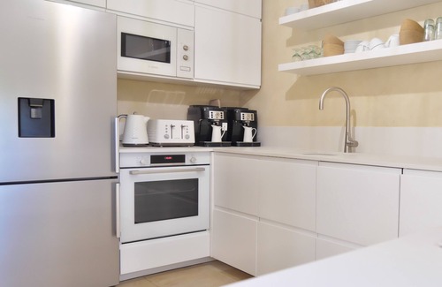 Fully equipped kitchen, outdoor barbecue, large adjoining dining room, and large living room.