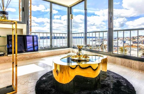 Experience Lisbon from a stylish top-floor apartment with breathtaking panoramic views of the city and the Tagus River. Floor-to-ceiling windows flood the space with natural light, highlighting elegant gold accents and contemporary décor. Enjoy the comfort of AC, cable TV, and free Wi-Fi. The fully equipped kitchen and plush bedroom ensure a relaxing stay. A lift reaches the 6th floor, but there is no step-free access. Pets are welcome!