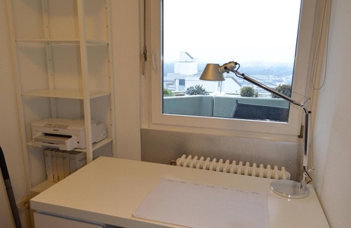 The apartment is located on the 12th floor of a residential building (lift available). It consists of a living / dining room, an office / children's room (with bunk beds, bed linen available), a bedroom (with double bed in 1.60 x 2.00 m, linen provided), a kitchen (with espresso machine, dishwasher, full kitchen equipment available), a bathroom (with Siemens washer-dryer, clothes horse, iron and ironing board, towels provided), a separate toilet, a large south/west facing balcony with breathtaking views and a hallway. Also available is Wi-Fi and car parking in the garage.