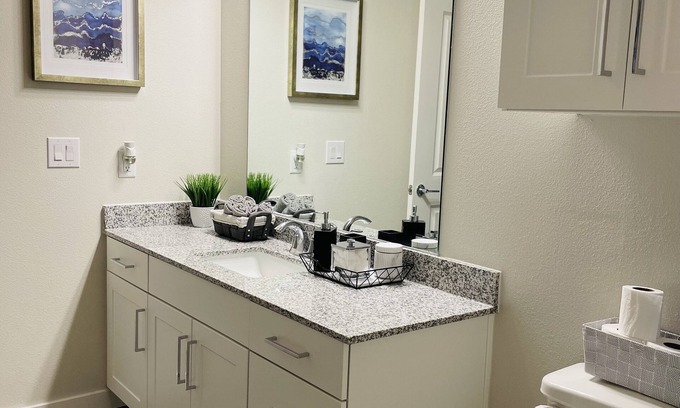 Feel at home away from home in this spacious and serene space fully equipped for long-term stays. High-end linens and furniture are set in a comfortable and cozy setting. The area is perfectly situated in a highly connected part of Spring/Cypress with plenty of shops, restaurants, and grocery stores a stone's throw away.