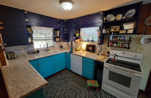 A solid block house. Tounge and groove wood paneling, lots of books, and a sun room with lots of windows. All kitchen utensils, bedding, and linens provided. Garage not included. Next to Spence Park with tennis courts and basketball courts and swings.