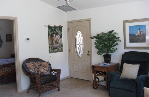 Handicap accessible. Guesthouse includes kitchen, dining area, living area, bedroom and bathroom. The queen sized bed is very comfortable with sheets and blankets supplied. Kitchen is stocked with silverware, plates, cups, towels, appliances, pots and pans. Bathroom complete with towels, soaps and shampoos. Dining area with table and four chairs.