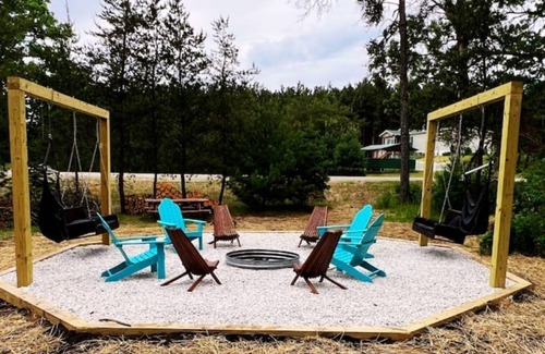 Get ready to relax in style around our new fire pit. It's no ordinary pit, my friend. We're talking about two bench swings and two hammock swings encircling the flames, so you can swing, relax, and soak up the heat in style. And don't worry, we've got plenty of standard seating for your whole crew.