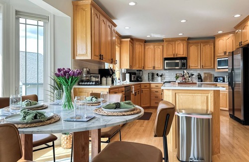 Adjacent to the living area lies the heart of the home - a fully-equipped kitchen with a coffee station and 2 dining areas. The first seats 4 people right by the windows and the deck access – easy for taking your morning coffee with you to soak in the views!