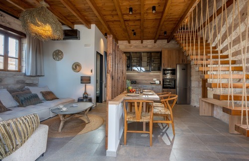 This enchanting 1-bedroom villa covers 100m2 and boasts a cozy living room, kitchen and two bathrooms. The quaint cottage-style architecture and rustic wooden accents create a charming and cozy atmosphere, perfect for a romantic couple getaway or a private and comfortable stay for a three-membered family (one guest can be accommodated in the living room sofa). With its combination of stylish decor, modern amenities, and excellent location, Sunshine Villa is a place where you can relax after a long day of sightseeing around the island.