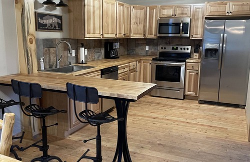 Open concept kitchen, dining and living room make this cabin a great entertaining space. Main bedroom includes a king size log bed, six drawer dresser, desk and 55 inch screen tv. Second bedroom includes a queen size log bunk bed and armoire. You will find a queen pull out in the sofa located in the Living Room. Also in the living room is a 65 inch smart tv, lounge chair and two recliners.