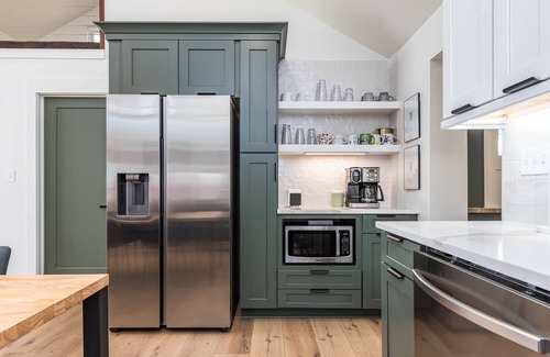 After entering through the multipurpose entry room with full-size laundry and golf bag storage, the house opens up to an inviting kitchen & great room area where you and your guests can enjoy the lake view through a wall of windows. Chat it up over dinner at the butcher block kitchen table that seats up to 8 guests or plop down in the comfortable living room area with seating for 4 to 6 guests. Four cozy bedrooms for up to 8 guests surround the great room and feature large desks and king-sized beds with ample space to store all your luggage below.