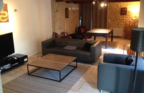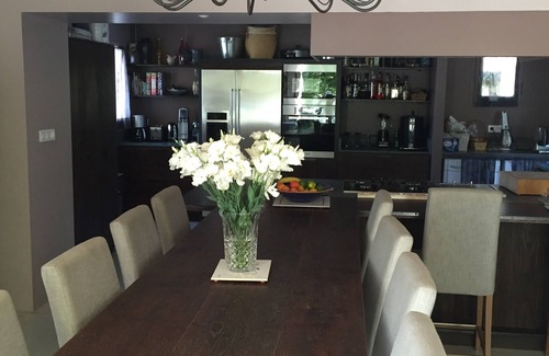 Contemporary upscale kitchen custom made by Xavier’s, a renowned Belgian kitchen designer. Featuring high end stainless steel Miele appliances: double American Fridge, full oven, microwave, top of the line gas stove and a built in plancha. Washer and dryer. Fully equipped to cook or bake any gourmet meals. (also all types of coffee maker, trancheuse a jambon, beer tender machine, soda stream, etc..) Large island connected to a 10 person sitting table. Industrial loft look with “béton ciré” floors and metal details. High end materials used: "chêne massif" and counter / sink “taillés dans la pierre, pierre bleue”. Original traditional ceilings refurbished. “Poutres apparentes et platre”. A “pole a bois en fonte” provides radiant heat during cold fall or spring nights.This is the place where you’ll spend most of your time as everyone tend to gather around the central table.