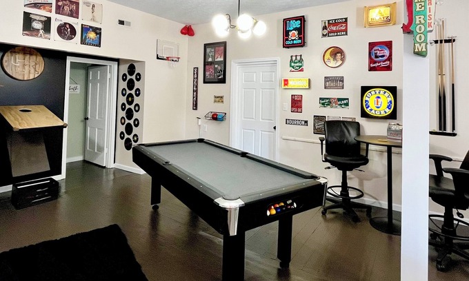 This 2-bedroom apartment is perfect for your escape to Bardstown. Nestled in the heart of the city, this enchanting property offers a fabulous retreat for guests. With a king and queen bed, you'll find comfort and relaxation in every corner. Immerse yourself in the fun amenities including pool table, arcade games, golf green, basketball, WiFi, and more! Allow us to host your stay while Experiencing the Bourbon Capital of the World! Kids are welcome too!