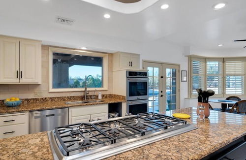 Your group will love the private sports court, optionally heated pool, outdoor kitchen with wood-burning pizza oven, game room, and overall lavish feel of our 3500 sq. foot home!
