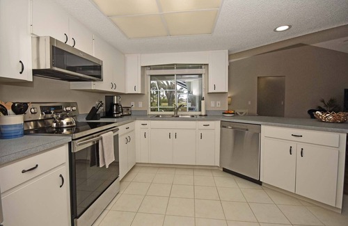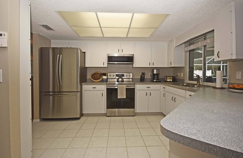 This home offers a split floor plan. The Master bedroom, with a king bed and a 32" flat screen tv with Blu-Ray player, has access to the pool area. The guest rooms, consisting of a queen bed and two twin beds are located at the opposite end from the Master. Open kitchen concept offers easy access to all rooms and is equipped with all stainless-steel appliances and a breakfast bar with easy access to all rooms. The den has a 55" flat screen tv with Blu-Ray player.