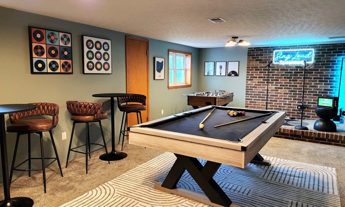Step back in time into this fun inspired home only 25 minutes from the Hocking Hills. Enjoy beautiful views of Lancaster and Mt. Pleasant from the living room bay window, or unleash your competitive side in the Game Room. The Game Room features Karaoke, Pool, Darts, and Foosball.