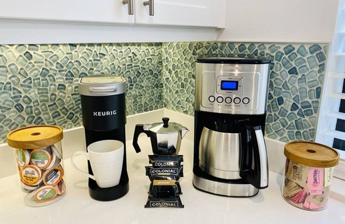 We provide pool towels, bath towels, and all linens. We also provide shampoo, conditioner, body wash, toilet paper, paper towels, and garbage bags in the kitchen. The kitchen is fully stocked with pots, pans, coffee maker (drip system and Keurig), and toaster.