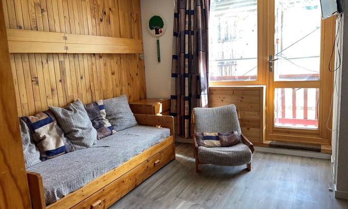 Ski in ski out studio, South exposition facing the pistes. Close to the shops.