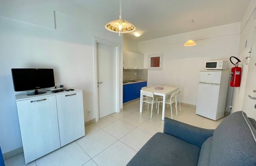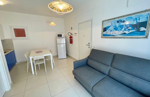 Functional flat for up to 6 guests, located on the first floor of a one-storey house without lift, only 240mt from the beach. It is composed of a living room with a double sofa bed, a kitchenette, a spacious balcony, a bedroom with a double bed, a second bedroom with two single beds, and a full bathroom with a shower box. One uncovered parking spot is included. There's a shared laundry room for the whole residence. A/C is available at an additional cost (check below).°Photos are generic and representative of the accommodation type (furniture, décor and colors may vary)