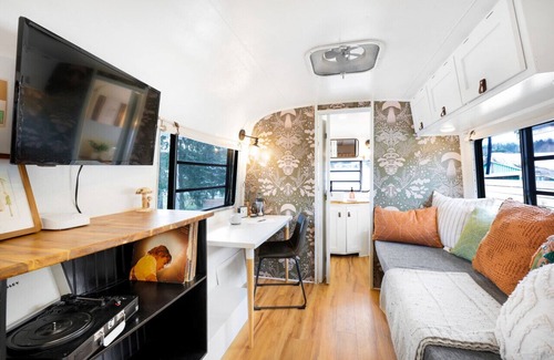 The interior includes a California king mattress (sleeps 2), as well as a couch that can be converted to a bed at night (sleeps 1). The kitchenette includes a 2-burner induction cooktop, a sink, a microwave, a toaster, and of course, a coffee maker. There is a table to eat at and play games, a desk for a working vacation with high speed internet, and a record player that doubles as a Bluetooth speaker. There is air conditioning and heating. The bathroom has a toilet and shower. There is a tiny 4-gallon hot water tank which only allows for a brief 5-minute shower before running cold. You've been warned! It is glamping after all.