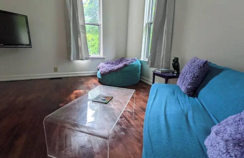 -Living/Dining room with dining table, futon, bean bag chair & TV. Kitchen with stove/oven, fridge, and other essentials (even an air fryer!)
