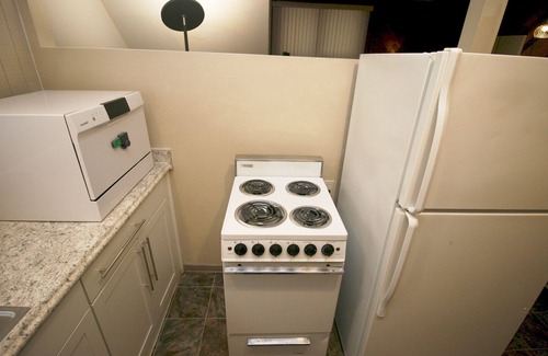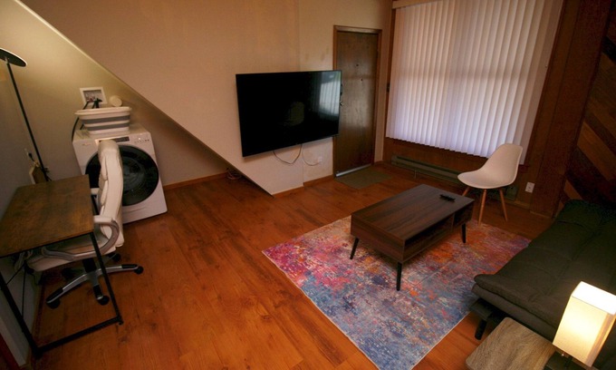 This 1bd/1ba apartment packs a lot of amenities into a cozy space. Full-size all in one washer/dryer combo machine that washes and dries in one step without the need to move wet clothes around. Mid century modern style living room space with a memory foam futon and a 65" 4K Roku smart TV on a 22" articulating wall mount. Desk with high-back office chair and power strip. Kitchen includes a full size fridge, 20" oven range, countertop dishwasher, countertop air fryer oven, microwave oven, Instant Pot pressure cooker, toaster, and coffee maker. Bedroom includes a queen size memory foam bed with cooling memory foam topper, duvet and cotton linens. High speed Wi-Fi backed by a fiber optic internet connection. Electric baseboard heating. Portable air conditioner. Built in floor-to-ceiling cabinets in pantry and bathroom. The apartment's door includes an electronic combo deadbolt and opens into an enclosed stairwell. Tankless hot water heater for uninterrupted showers.