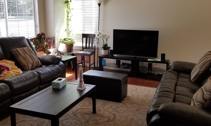 A furnished bedroom with a queen size bed, in a two bedroom single family home. You will have access to living room and kitchen as well. It's a one story wheelchair accessible house. Garage space available if requested. It's half a mile from HWY 99 and close to many retail store, park, fire station and hospital. No smoking, no pet, no drug. Only two neighbors in the vicinity, which makes it a pretty peaceful neighborhood.