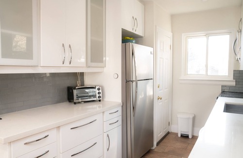 Furnished 2-bedroom unit of a main level house with very spacious dining + living area and spotless beautiful renovated kitchen, brand new kithcenwares, freshly painted in a: