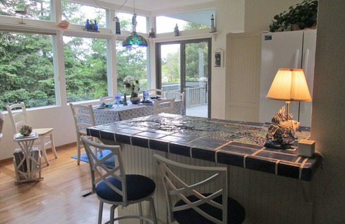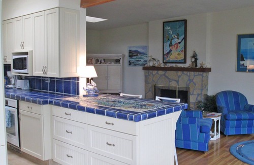 The spacious upper level, decorated with whitewashed wicker, is warm and inviting in wonderful colors of blue, turquoise, jade and white. The hardwood floors throughout add to the beauty and warmth There is a gas-burning stone fireplace to keep you cozy on cool nights. The entertainment center features an HDTV with streaming Internet, including Netflix. The dining table seats six and has a filtered view of lacy redwoods The newly remodeled kitchen features two more of Diane's beautiful mosaics that complement the handmade blue tile counter tops in the kitchen.
