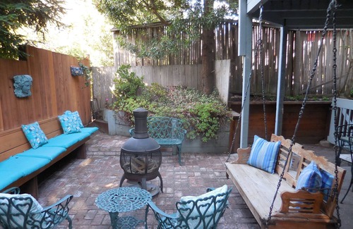 'Out of the Blue' has a lovely enclosed backyard with used brick patio and lush plants. There is a small table, chairs and a chiminea on the patio for relaxing and a dining table for outdoor entertaining, along with a gas barbecue.