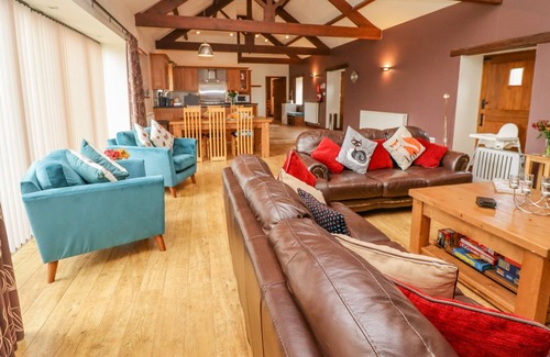 The living area is open plan with fabulous exposed beams. There is a well-equipped, stylish kitchen that has an electric oven and hob, microwave, fridge, small freezer, dishwasher and a washing machine with integral dryer. The dining area is ideal for relaxing and enjoying meals and adjoins a large sitting room area with comfortable sofas, a book and film library and large Smart TV and DVD player.