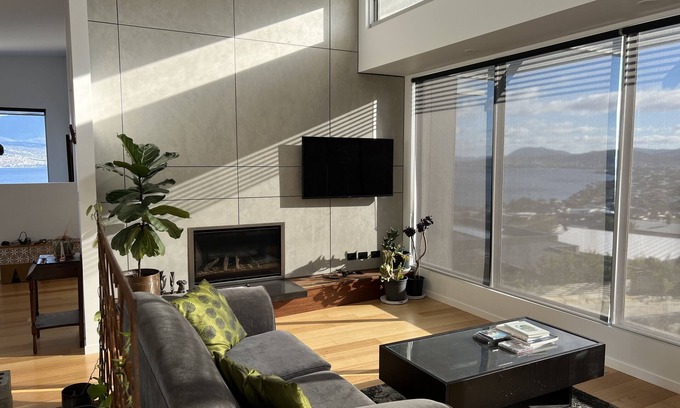 Suitable for short or long stays, this house is luxurious, spacious and full of charm, with panoramic views over the river Derwent looking towards the city and Mount Wellington. The view is magnificent day and night, every day is different and the varying palette of colours and hues of the vista is awe inspiring.