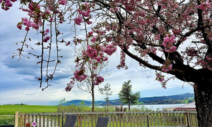 ‘Welcome to our garden flat in the “Seeblick” guest house! This spacious flat can accommodate up to four people and is ideal for families. The two spacious bedrooms, one of which has a large TV, offer comfort and privacy. The spacious garden with three sun loungers invites you to relax and offers a breathtaking view of the lake and the surrounding mountains. The dining area with another TV and a work area at the bar allows for flexible living and cosy evenings. The newly renovated bathroom offers modern comfort, while the handmade beds from the carpenter with deluxe mattresses from the local company Elastica promise restful nights. The fully equipped kitchen invites you to prepare delicious meals. WLAN is available so that you can stay connected to the world at all times. Additional seating in the garden provides the perfect place for sociable evenings outdoors.