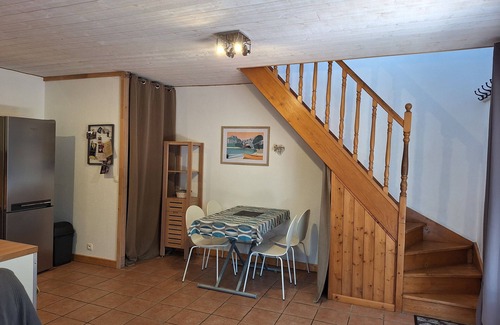 It is equipped to accommodate 4 people with 2 bedrooms (one with a double bed of 160 and one with 2 bunk beds), a bathroom with shower and WC on the floor. On the ground floor an open kitchen and a living room with a sofa convertible into a 160 bed. A terrace and a garden not overlooked allow you to fully enjoy the outdoors in the shade of the trees.