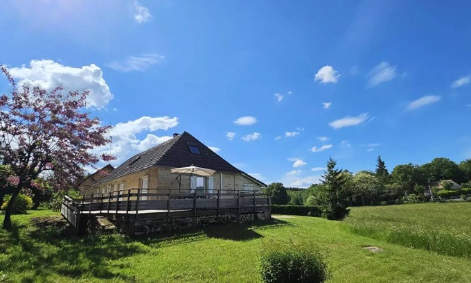 Residence: Nestled on a hill in a peaceful area, a few steps from the renowned Turenne Castle, this independent cottage invites you to enjoy a large private estate of 3 hectares fully fenced. It is a real haven of peace for young and old, where even a part of hide-and-seek can turn into an unforgettable adventure!This warm and functional house offers an ideal stay setting for relaxing holidays with family or friends. The living room, with a patio door, opens onto a spacious terrace, perfect for outdoor dining or to enjoy the serenity of the place. The terrace surrounds the living space, creating a harmony between the interior and the surrounding nature.To discover nearby: the village of Turenne, classified among the Most Beautiful Villages of France, with its charming cobbled streets, historic houses and castle overlooking the valley, as well as the picturesque villages of Collonges-la-Rouge and Curemonte.
