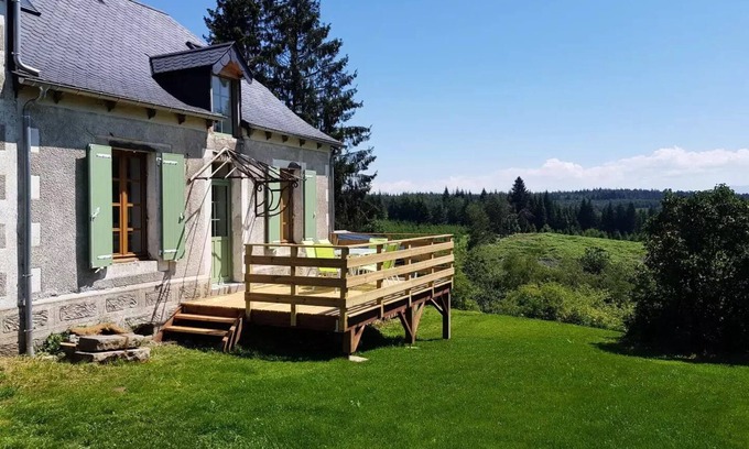 Accommodation: Located on a large green and wooded park, in the heart of the Millevaches plateau, charming independent house completely renovated with a superb panoramic view of the surrounding nature and especially the Massif du Sancy. The house consists of a living room, dining room with a bar and a fully equipped kitchen including washing machine (1 small steps to reach the kitchen), a double bedroom on the ground floor. The floor consists of the bathroom, a toilet and two double bedrooms (one with a bed 2 people and another with 2 single beds if necessary).A large terrace. Dependence: Locked storage shelter for bicycles (6 bikes approx.)The price includes: Electricity up to 8kWh/day (beyond charging)The price does not include: The optional cleaning €75/stayBed linen 8€/pairToilet linen 6€Animal supplement : 5€ / dayIf + one dog 6€/day for the second In winter about 12€/night The gîte offers calm in the heart of the Correzienne countryside, fresh air, starry sky and bird singing. From its terrace, you can admire the magnificent landscape offered by the viewpoint, book in the shade of trees, enjoy the long summer evenings around the barbecue and enjoy the quietness of the region. The cottage will allow you to discover many tourist places in the vicinity. In September you will be best placed for deer bram and mushrooms picking. Thalamy Aerodrome - St Exupery just 4/5 km away. Price Does not include: The optional cleaning €75/stayBed linen 8€/pairToilet linen 6€Animal supplement : 5€ / dayIf + one dog 6€/day for the second In winter about 12€/night