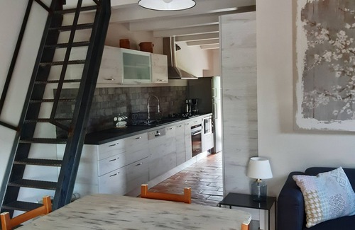54 m2 living space including a living room (kitchen / dining room / living room), 1 bedroom with a bed 160 cm and 1 bedroom with 2 beds 80 cm, a bathroom with a toilet, plus a separate toilet. In addition to the living space, a mezzanine adds a relaxation / reading area. Very well equipped: dishwasher, oven, electric, microwave oven, 4 burner hob, washing machine, iron, ironing board, TV ... Many cupboards. Large shaded terrace, garden, parking.