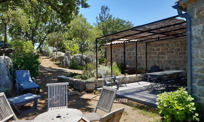 Terraced house in stones without opposite and completely independent, newly done up. It is located on a large plot of one hectare on "hanging gardens", quiet and surrounded by nature, 3 minutes walk from the village (restaurants, small country groceries, crafts) and the river with its many beaches. Ideally located to visit the south of the Ardèche. Hiking trails from the cottage. 3 stars classification by the FNAIM.