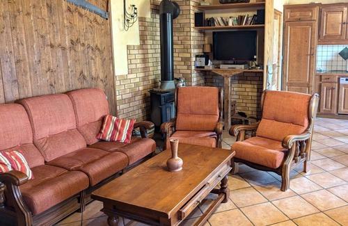 In peaceful countryside setting, cosy traditional gîte in renovated farmhouse, also including owners' home at the back of the house. Separate entrance, country-style décor (exposed beams, nice furnishings...), very comfortable. Upstairs : large terrace (18 sq.m) leading into large living room (exposed beams, nice furnishings), lounge/ dining areas, fitted kitchen. Laundry room. 2 Wcs. 3 bedrooms: (double bed, cot, ensuite shower room), (double bed + 2 single bunks), (double bed + single bed). Many storage areas. Bathroom (bath, shower, dual washbasin). Loan of mobile phone on request. Private garden, sunbeds, shared play area (table tennis, trampoline, boules set). Charge for pet: 10€/day. On request, tour of owners' goat farm (7 km away, produce sale available).