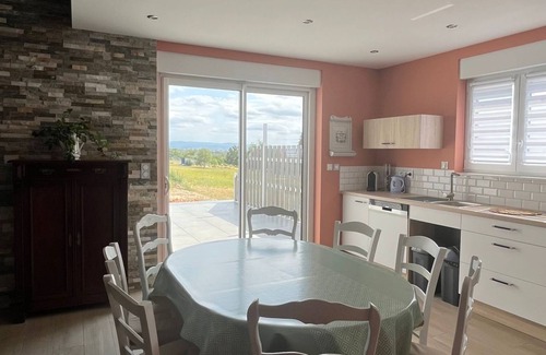 From the kitchen, you have access to a terrace with an unobstructed view of nature and the blue line of the Vosges mountains, complete with garden furniture and deckchairs.