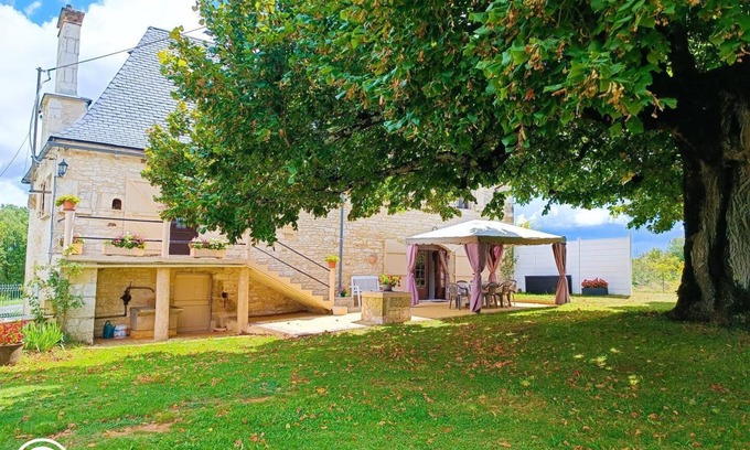 Family house whose origins date back to 1880, renovated as a gîte since 1995, situated in a pleasant environment on the Gignac plateau, overlooking the surrounding countryside, and benefiting from a pleasant enclosed park full of flowers where a majestic secular linden tree provides a beneficial shade and ideal for outdoor meals. The gîte is situated on the borders of the generous and authentic Dordogne Valley, of the Périgord Noir, which conceals rich prehistoric sites and concentrates an exceptional heritage. Classified as a 2-star tourist accommodation on 20/11/2018. Ground floor: dining room/kitchen area of 40m2 with insert, shower room with wc. In 1/2 floor: living room of 30m² with open fire place. First floor: 3 bedrooms of 9m² (2 beds 140, 2 beds 90), shower room, separate wc. Auxiliary wood heating. Terrace of 40m², enclosed grounds of 2000m². Small animals only accepted.