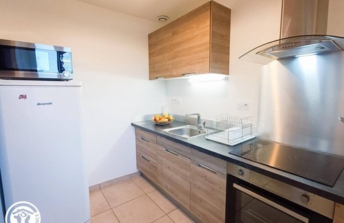 The kitchen is equipped with a refrigerator, a dishwasher, and a microwave. And because there's access to laundry facilities, you can go a bit lighter on your packing.