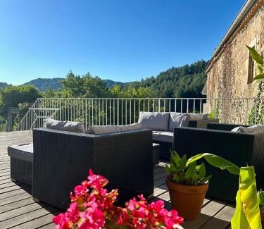 Gîte de Vermalle is a recently renovated vacation home in Rocher where guests can make the most of the infinity pool and garden. The property is around 20 miles from Pont d'Arc, 21 miles from Ardeche Gorges, and 13 miles from Casino de Vals-les-Bains. The accommodation features a shared kitchen and a concierge service for guests. With free Wifi, this 5-bedroom vacation home provides a flat-screen TV, a washing machine, and a fully equipped kitchen with a dishwasher and oven. Guests can take in the views of the mountain from the terrace, which also has outdoor furniture. There's also a seating area and a fireplace. Guests can enjoy a meal at the on-site family-friendly restaurant, while packed lunches are also available upon request. Guests at the vacation home will be able to enjoy activities in and around Rocher, like cycling. Paiolive Wood is 19 miles from Gîte de Vermalle, while Chauvet Cave is 20 miles away. Le Puy – Loudes Airport is 62 miles from the property.