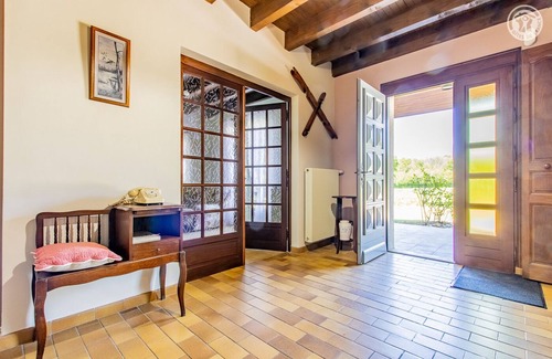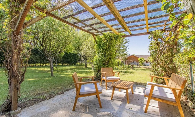 Lovely "eighties" pavilion carefully revisited as a sweet holiday resort, nestled in a quiet "cul de sac" at the end of an intimate little dead end, in a peaceful residential area located a stone's throw from the center of the town and its amenities. Soothing preserved rural setting, nestled on the edge of a bucolic meadow adjoining the wooded park of the prestigious neighboring castle (17th century building listed as a historic monument, now housing the very famous Écomusée de la Bresse). Nestled in the hollow of the verdant bocage valley of the Doubs on the first mountainous foothills of the Jura massif, Pierre-de-Bresse benefits from a magnificent preserved rural environment combining nature & agriculture, has many shops & services and offers a very good level of sports & leisure facilities (fishing lake with ecological leisure center protected in "Natura 2000 Zone" for the richness of its fauna & flora / "sports course" & "Parkrun" in the superb park of the castle / "Agorespace" etc ...). Comfortable cottage. Ultra spacious. Exotic country character with "vintage" touches. Large panoramic terrace offering a beautiful unobstructed view of the surrounding meadows & woods. Pleasant lawned, planted & wooded garden of 400m² (nestled away from prying eyes), perfect play area for children, including a shaded "outdoor" relaxation lounge under a pergola & a mini fruit orchard (pear trees, cherry trees, apple trees, peach trees, mulberry trees, vines etc. / picking possible during your stay). Possibility of observing wildlife on site (deer, rabbits and hares, squirrels etc.). Composition: Detached house. Wifi. Ground floor: kitchen, living room, 1 bedroom (double bed 140x190cm), bathroom (bathtub), separate toilet. 1st floor: 2 bedrooms (1 double bed 140x190cm + 1 single bed 90x190cm / 2 single beds 90x190cm), relaxation area, separate toilet. Terrace + garden + bicycle storage + private parking. Supermarket 300m. Amenities 1 km away.