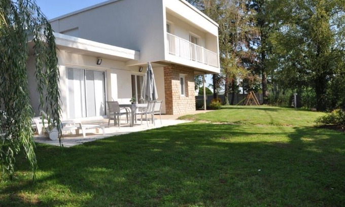 Superb modernist "seventies" villa with remarkable avant-garde architecture of Californian inspiration - fully restored according to the rules of the art - located on a beautiful enclosed and wooded property of 1500m² (electric gate) with a large terrace exposed & shaded. Residential area in the countryside, on the edge of fields and forests, bordering the village of Cuisery, listed among the very exclusive 8 French "Book Villages" (17 dedicated professionals on site; booksellers, second-hand booksellers, record dealers, antique dealers, book artisans, artists ). Charming typical medieval village and merchant steeped in history nestled on the banks of the Seille (remarkable ecosystem classified as Natura 2000 navigable for 39 km: migratory bird reserve, rare plant species, numerous fish, animals and wildlife, etc.), equipped with a superb church in flamboyant Gothic style from the 16th century and a naturalist museum with a renowned planetarium ("Centre Eden"). Nestled on a promontory, the village offers a breathtaking view over the Bresse plain to the Jura mountains. Very comfortable cottage. Spacious & bright. Seductive contemporary chic and neat character. Very charming. Residence of style and character. Zen & cozy atmosphere. Complete quality equipment. Composition of the gîte: Detached house on 2 levels. Wireless. Central heating (oil). Ground floor: living room-kitchen-lounge, 1 bedroom (double bed 140x190cm) with private bathroom (shower), separate toilet, laundry room. 1st floor: 3 bedrooms (2 with 2 single beds 80x200cm which can be combined into a double bed 160x200cm / double bed 160x200cm) including 1 with private bathroom (shower/wc), bathroom (bathtub), wc independent. Sheltered balcony + terrace. Enclosed land. Bicycle storage. Private parking. Shops & services 2 km. Train station 9 km. Mâcon Loché TGV station 45 km.