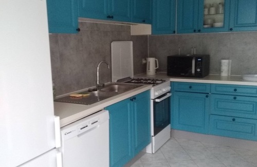 The kitchen is equipped with an oven, a stovetop, and a refrigerator, as well as a coffee maker, an electric kettle, and a microwave. And because there's access to laundry facilities, you can go a bit lighter on your packing.
