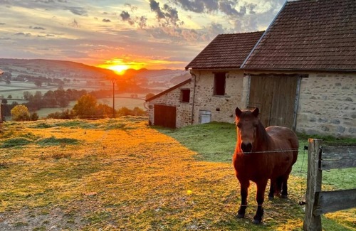 Located halfway between Autun and Le Creusot, in a quiet hamlet overlooking the valley, this former farmhouse with a detached house offers superb countryside views and ensures absolute tranquility with 10 hectares of private land all around. Ground floor: equipped kitchen and dining area, living room (TNT TV, sofa bed, library); shower room (walk-in shower), laundry room, toilet. Upstairs: 3 bedrooms (1 double bed and 4 single beds), shower room with toilet. Tastefully and warmly decorated. Oil-fired central heating. Swing and ping-pong table available. Trails start from the cottage (GR131).