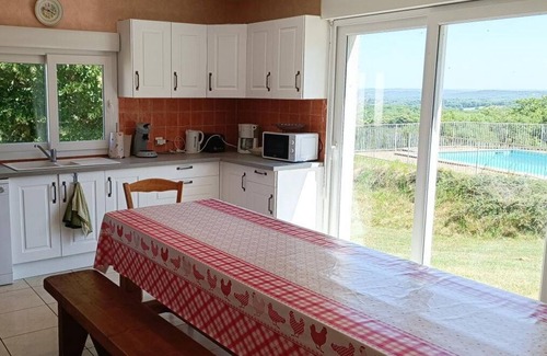 Gite comprising 2 independent houses located 50m from each other on a large plot and enjoying an unobstructed view of the Causse. Central location in relation to the major tourist sites of the Lot. Portico, sandpit, table tennis, bowling alley, mini-golf. PRIVATE SWIMMING POOL (12m x 5.50m) open mid-June to end of September. 2 kitchens, 3 dishwashers, 3 compart. freezer, fireplace, 3 color TV, tel. Téléséjour, 8 ch. (6 1.40m beds, 5 0.90m beds), 4 shower rooms, 5 toilets, lounge, garden furniture, open ground, summer kitchen, solar shower, mini-golf. Central heating.