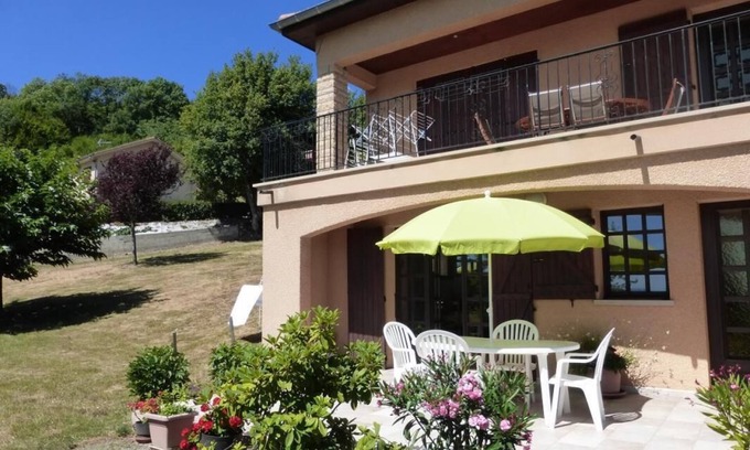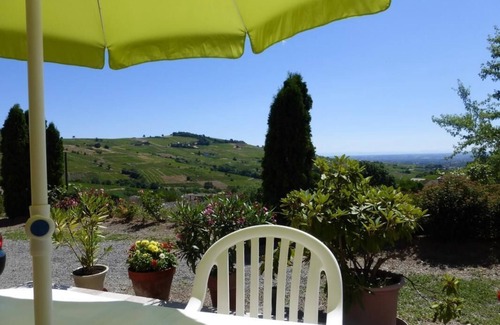 Gite on the ground floor of owner's modern house, with beautiful views of the Beaujolais vineyard. Kitchen, living room (loan of card-operated mobile phone), bed-settee for 2 children available, 2 bedrooms (160 x 200cm bed) (2 single beds), shower room, WC. Electric heating. Tiled terrace, garden furniture, barbecue. Unfenced garden, lawn. Ideal for holiday in the Beaujolais or close to the Burgundy region (Macon 20 km). Wine growers nearby, tours of wine cellars poss.. Charge for pet: 10€/day.