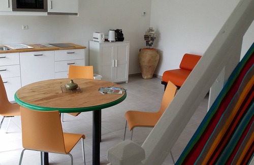 The kitchen is well equipped with crockery, cutlery, cooking pans, ceramic hobs, a Nespresso coffee machine, kettle and refrigerator. The dining area has a table with four chairs. The bedroom has a large double bed. Each cottage has its own Wifi, CAstra TV decoder and parking space.