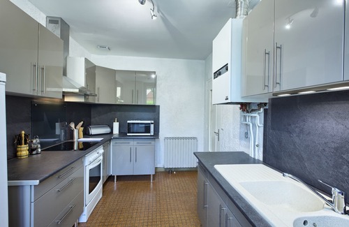 The kitchen is fully equipped with a large freezer with drawers, a large fridge, an oven, a microwave, ceramic hob, dishwasher, coffee makers ...