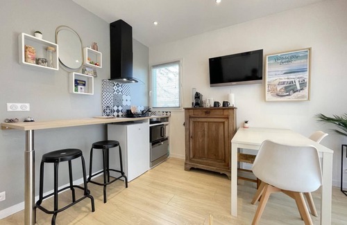 In a green setting, among pine trees, this pretty little gîte is located on one level in a wing of the owners' house. It is ideal for enjoying a peaceful stay in the Basque countryside. It consists of a day room with an equipped kitchen area (microwave, 2-burner hob, dishwasher for 6 place settings), living room and lounge area and a semi-partitioned bedroom area (1 bed 140) . Shower room/wc. Washing machine available at the owner's house (additional charge). Bed made on arrival. Bathroom linen included. Heating included. Internet access. End of stay cleaning included. The garden cabin located nearby offers you a relaxation area with spa, accessible free of charge for 1 hour/day as well as a terrace shaded by oak trees. 2 bicycles are available to guests, on request. Adjoining terrace with garden furniture. Car park. The La Lande gîte is ideally located for discovering the Basque Coast 40km away, exploring the Basque countryside and discovering the neighboring Landes department.