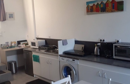 The kitchenette is equipped with an oven, a stovetop, and a refrigerator, as well as a coffee maker, an electric kettle, and a microwave. Bathroom amenities include a hair dryer and towels. And there's a washing machine, so you can even pack a bit lighter. Other amenities include bed sheets, an ironing board, heating, and a dining table.